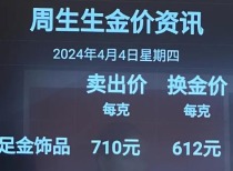 近期,随着国际金价的持续上涨,国内黄金零售价格也不断上涨。继4月3日首饰金价突破700元大关后,4月4日,记者在北京市朝阳区实地走访发现,部分黄金珠宝店铺的金价仍持续大涨,最高已达710元/克。再创新高,最高达710元/克“这阵子金价确实涨得比较厉害,昨天我们这边就突破了700元,今天又涨了。”一家周生生店铺店员4月4日告诉记者。